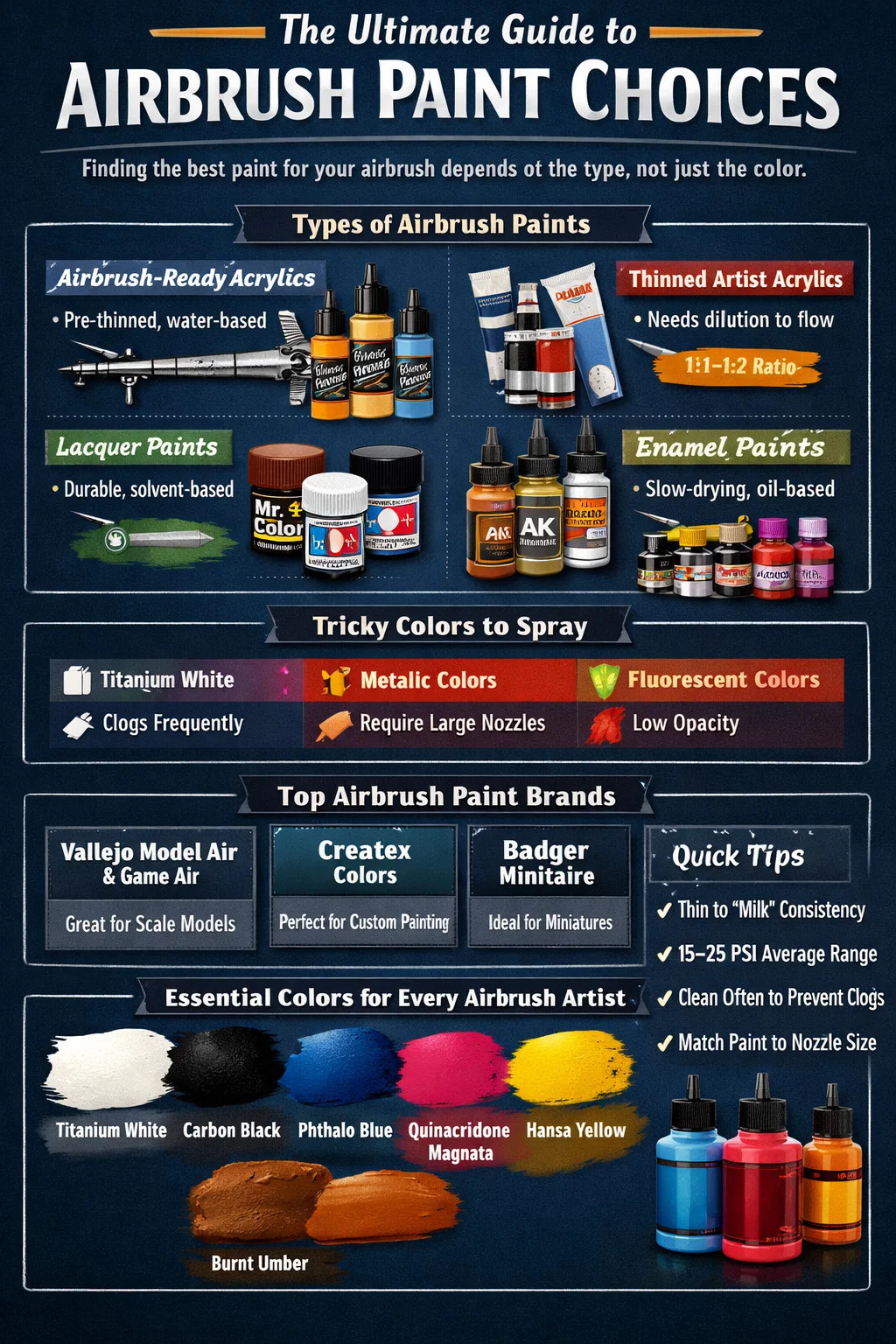 Jika anda mahukan jawapan langsung tanpa sebarang lencongan — Cat akrilik sedia berus udara adalah pilihan terbaik untuk kebanyakan pengguna berus udara , sama ada anda melukis model skala, kasut tersuai, seni kek, lukisan badan atau kanvas seni halus. Ia berasaskan air, tidak toksik, cepat kering, dan dirumus dengan zarah pigmen yang cukup halus untuk mengalir melalui muncung berus udara tanpa tersumbat. Jenama seperti Vallejo, Createx dan Badger Minitaire mendahului kategori ini untuk alasan yang baik.