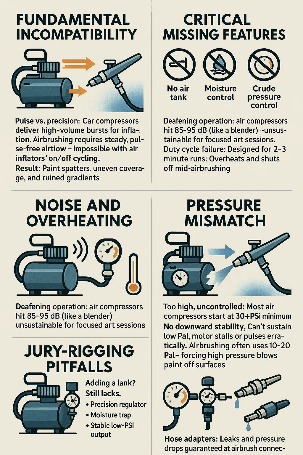 Pulse vs Precision: Pemampat kereta menyampaikan pecahan volum tinggi untuk inflasi. Airbrushing memerlukan aliran udara yang stabil dan bebas nadi-mustahil dengan inflator udara/off berbasikal.