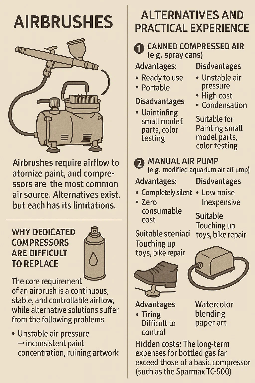 Airbrushes Memerlukan aliran udara untuk mengasah cat, dan pemampat adalah sumber udara yang paling biasa. Alternatif wujud, tetapi masing -masing mempunyai batasannya.