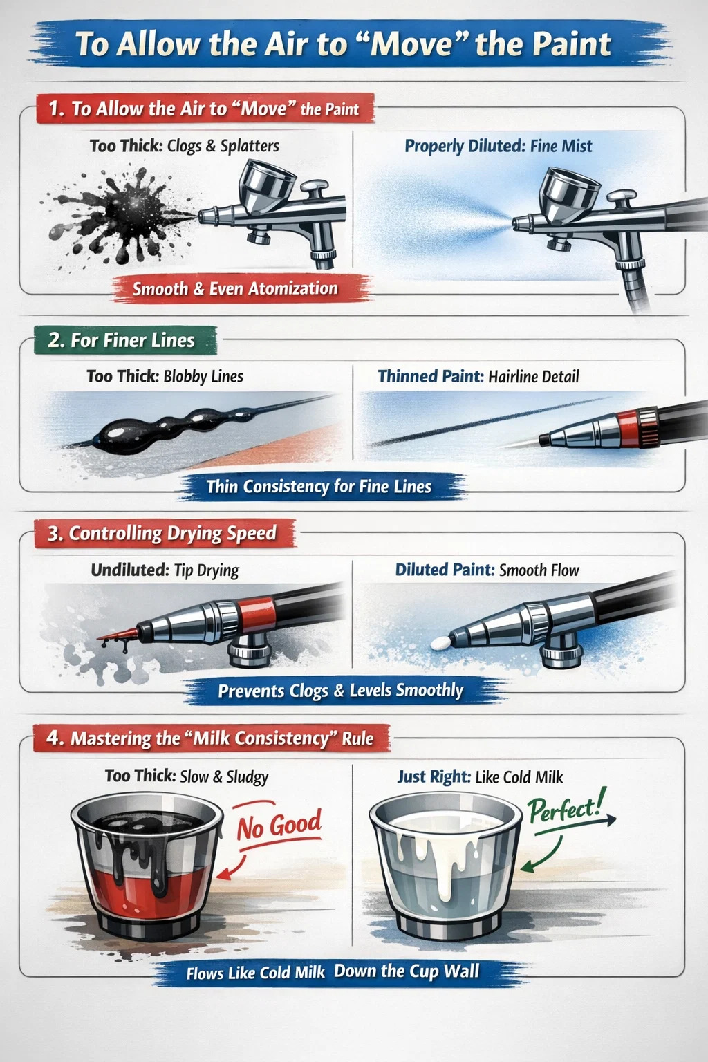 Mencegah "pengeringan hujung": Jika tidak dicairkan, cat selalunya kering pada hujung jarum sebelum ia sampai ke permukaan objek. Ini menyebabkan berus udara semakin tersumbat.