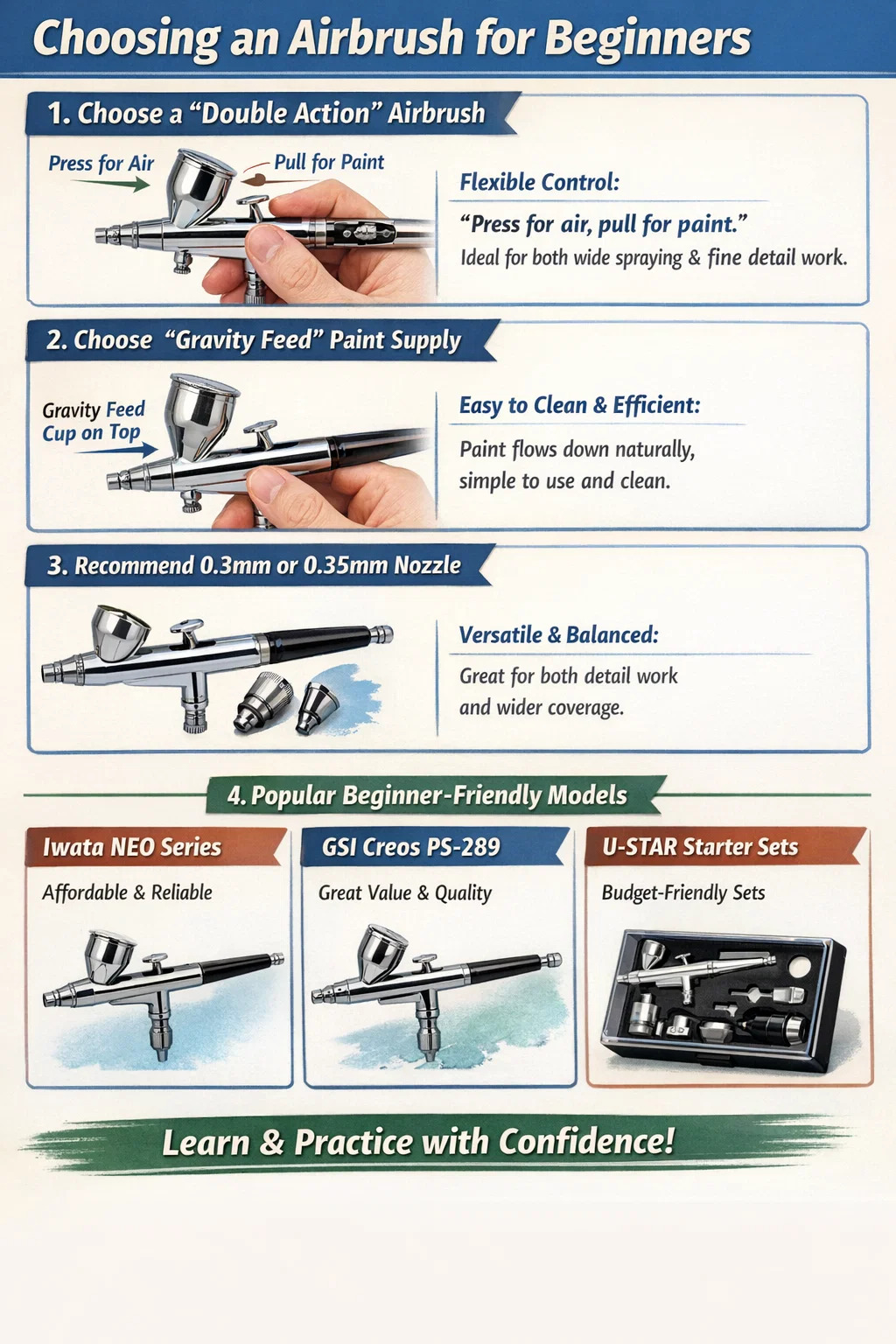 Untuk pemula yang baru bermula dengan berus udaraing , ketahanan, kemudahan pembersihan dan kemesraan pengguna adalah kriteria yang paling penting apabila memilih alat pertama mereka. Anda tidak perlu menyasarkan model profesional yang paling mahal, tetapi anda pasti harus mengelakkan produk yang dibuat murah untuk mengelakkan kekecewaan.